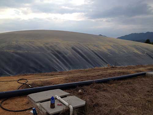 黑色土工膜覆蓋的沼氣池,學(xué)名“全封閉厭氧塘”